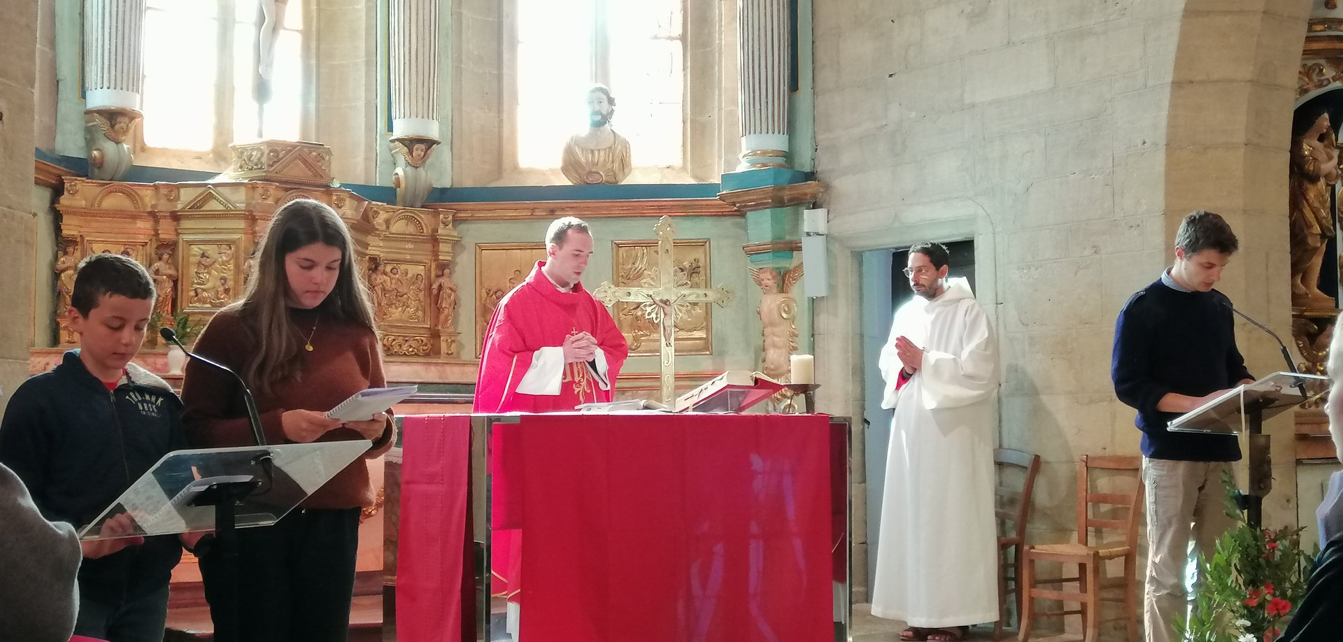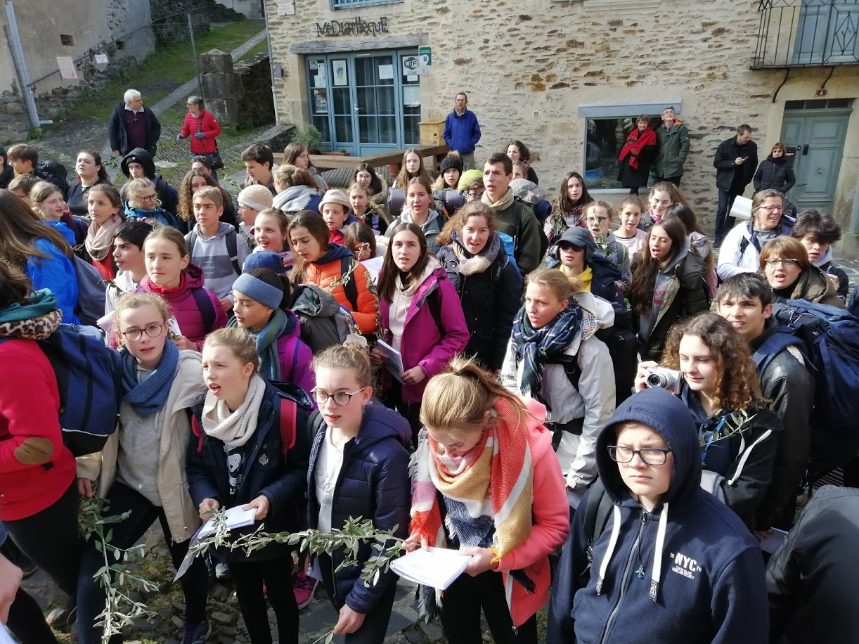 Estaing, Dimanche 14 Avril, dès 9 heures, 86 lycéens de la 6° à terminale de l’aumônerie de Libourne, arrivaient en chantant avec des branches de laurier à l’Eglise d’Estaing, précédés de leur aumônier assis sur l’âne Poire !