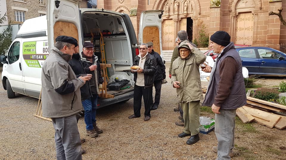 Préparation de la crèche 2018 dans la cour de l’église par la “Bourreio d’Olt”