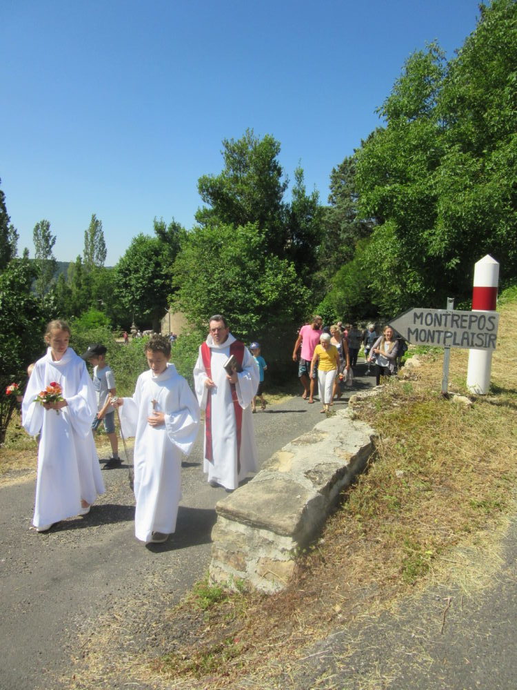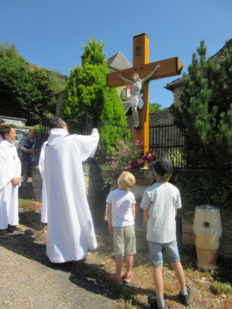 A l’issue de la messe, c’est en procession, à la suite du Père Barrié et des servants d’autel, que l’assemblée rejoignait la place du village. Entouré des enfants et sous un soleil radieux, le Père Barrié bénissait la croix. Chants et prières accompagnaient cette belle fête religieuse.