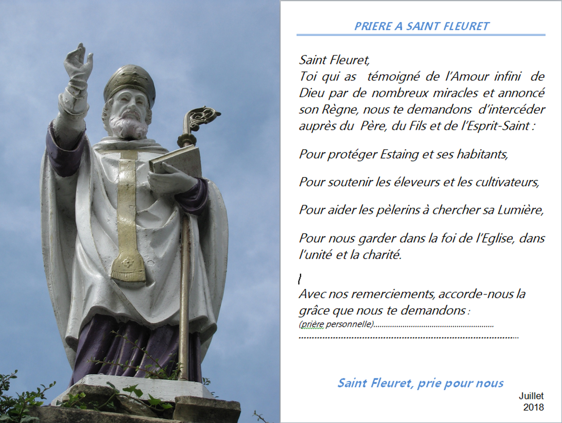 D’après les documents, Saint Fleuret, confesseur, est un évêque d’Auvergne du Vème siècle. Fidèle à Rome, il a lutté contre l’arianisme des Wisigoths qui tenaient à cette époque la Gaule aquitaine. A son retour d’un voyage à Rome, il séjourne à Estaing. La population est frappée par ses prédications, sa douceur et sa compassion. Après avoir fait jaillir une fontaine – la sècheresse sévissant dans toute la région – et guérit des malades, il envisage de continuer son voyage. Mais il tombe malade et meurt à Estaing. Sa réputation de sainteté ne fait aucun doute pour les estagnols.